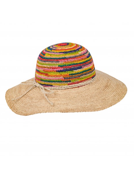 Belle capeline en raphia tressé en crochet.