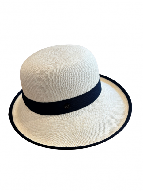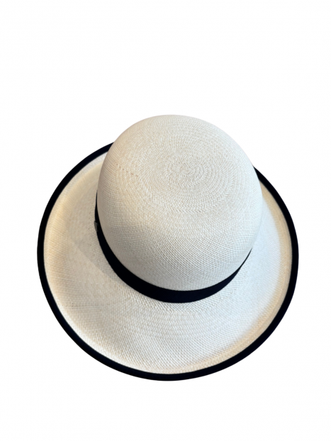 Entièrement tissé à la main en Equateur, berceau du véritable panama, ce modèle est réalisé en paille naturelle ( paja toquilla) reconnue pour sa légèreté. ( env 75g)
